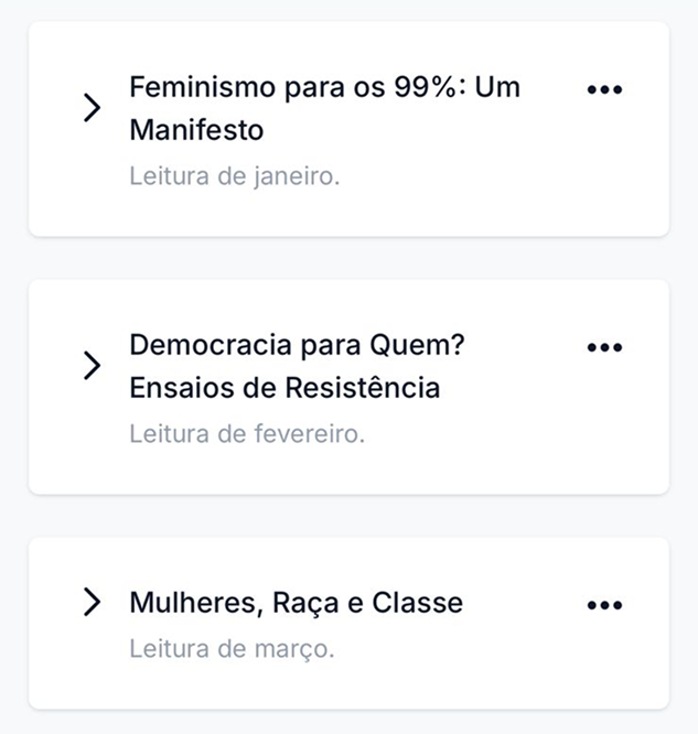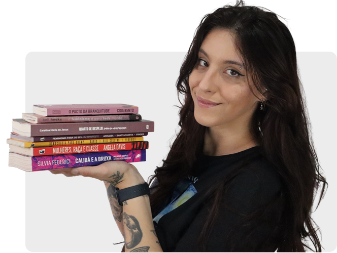 A cada mês, lemos um livro em conjunto, com encontros online ao vivo para discutir os capítulos, trocar ideias e fortalecer nosso repertório feminista.